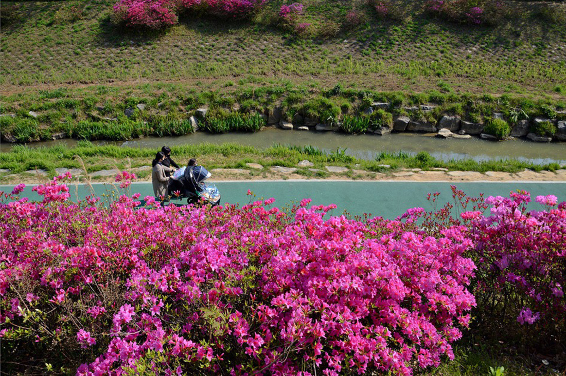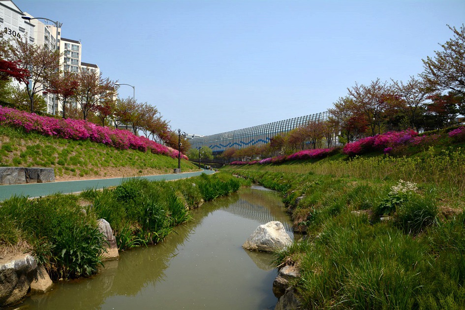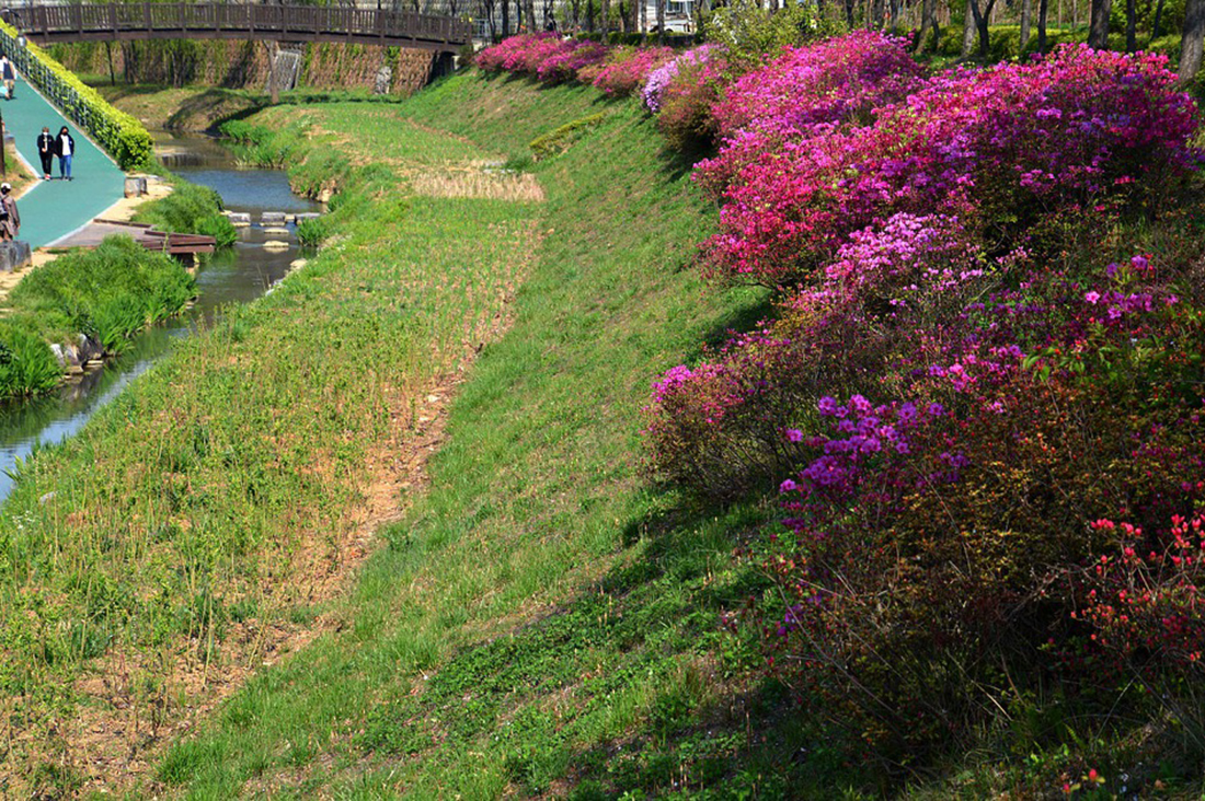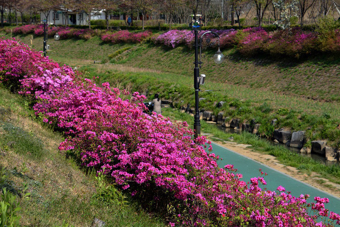 동네를 흐르는 실개천 양편으로 화사하고 아름다운 둘레길이 펼쳐지고 있다.(24년 04월 15일)