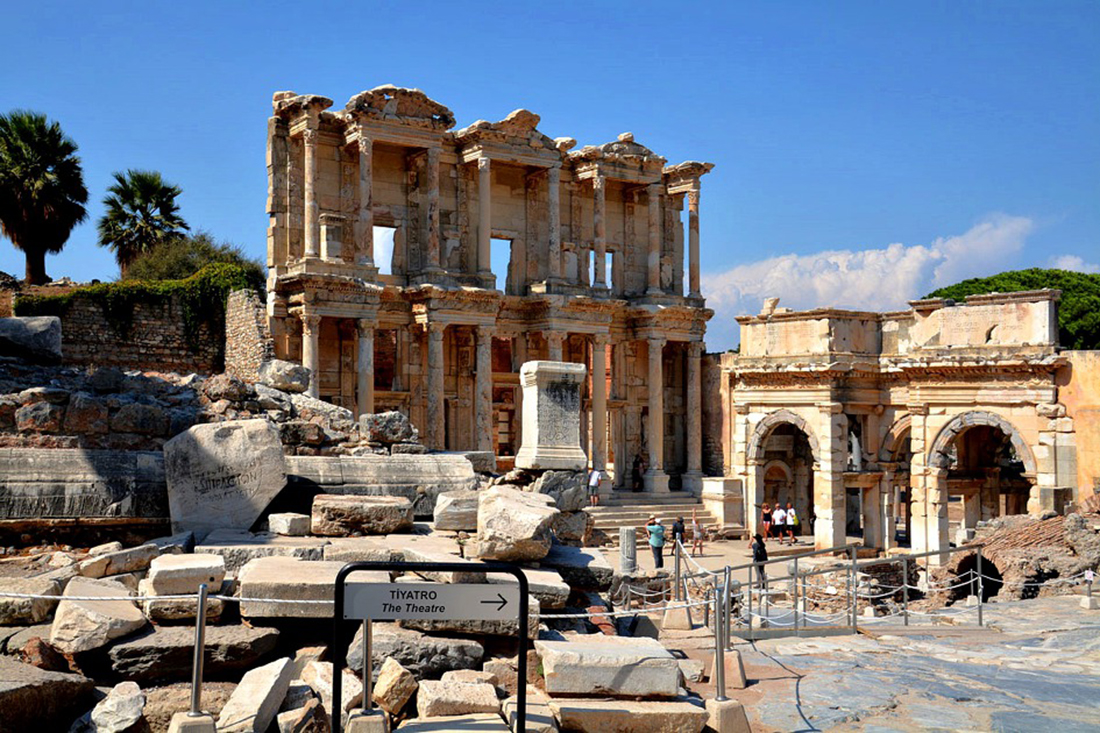 에페소에서 가장 훌륭한 건축물로 꼽히는 코린트식 건축양식의 도서관으로 정면에는 지혜, 운명, 학문, 미덕의 4가지를 상징한다는