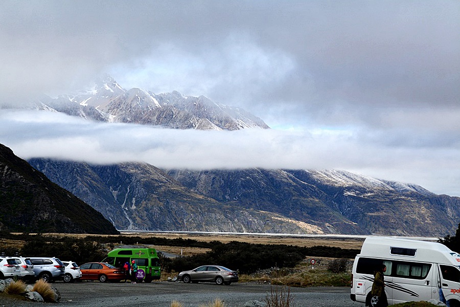 사이로 우뚝 솟아 있다. 마운트 쿡 마을은 크라이스트처치에서 차로 5시간 거리에 있다.