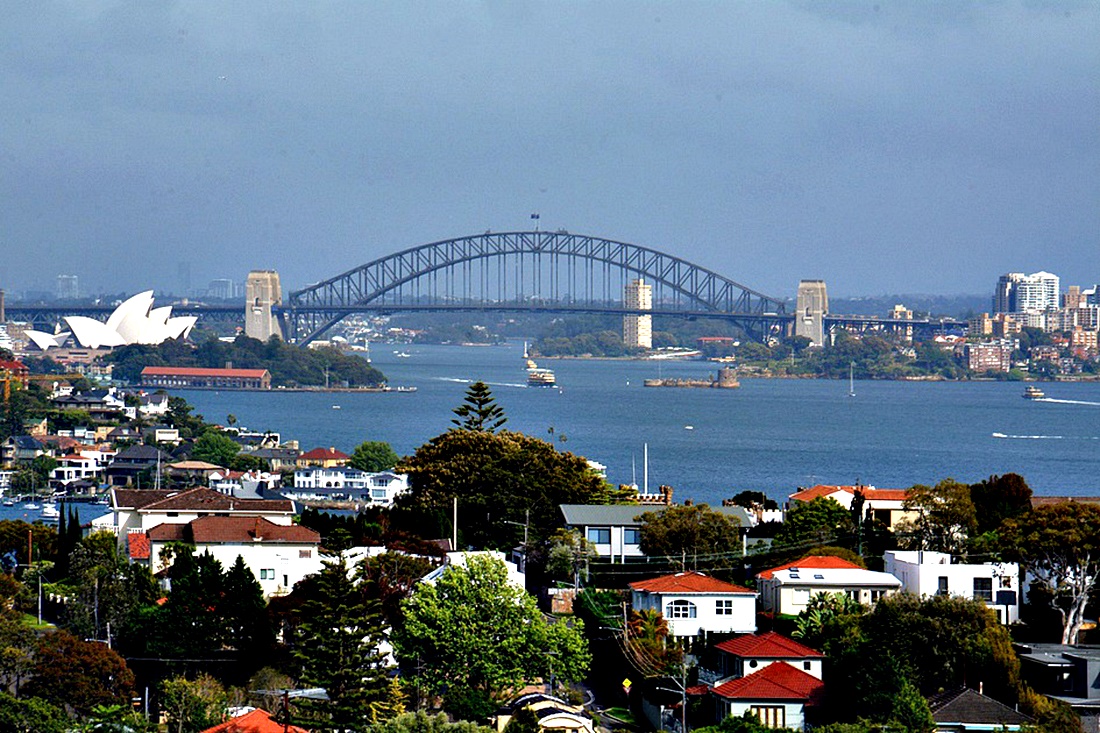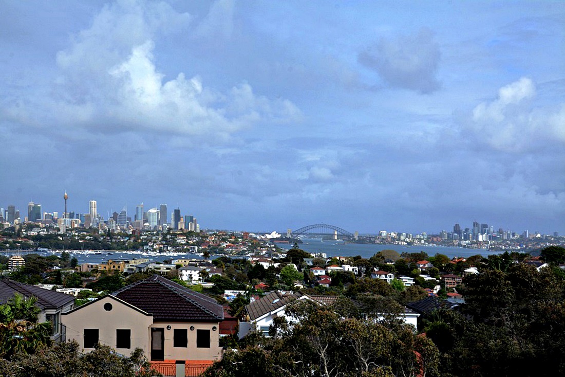 더들리 페이지에서 바라보는 시드니 시티는 푸른빛의 바다와 하늘, 멀리 보이는 하버 브리지, 오페라 하우스,