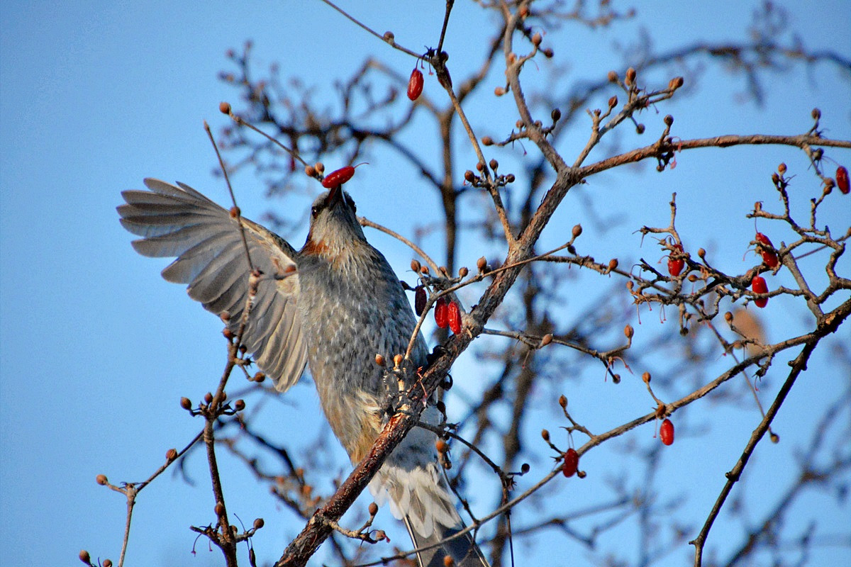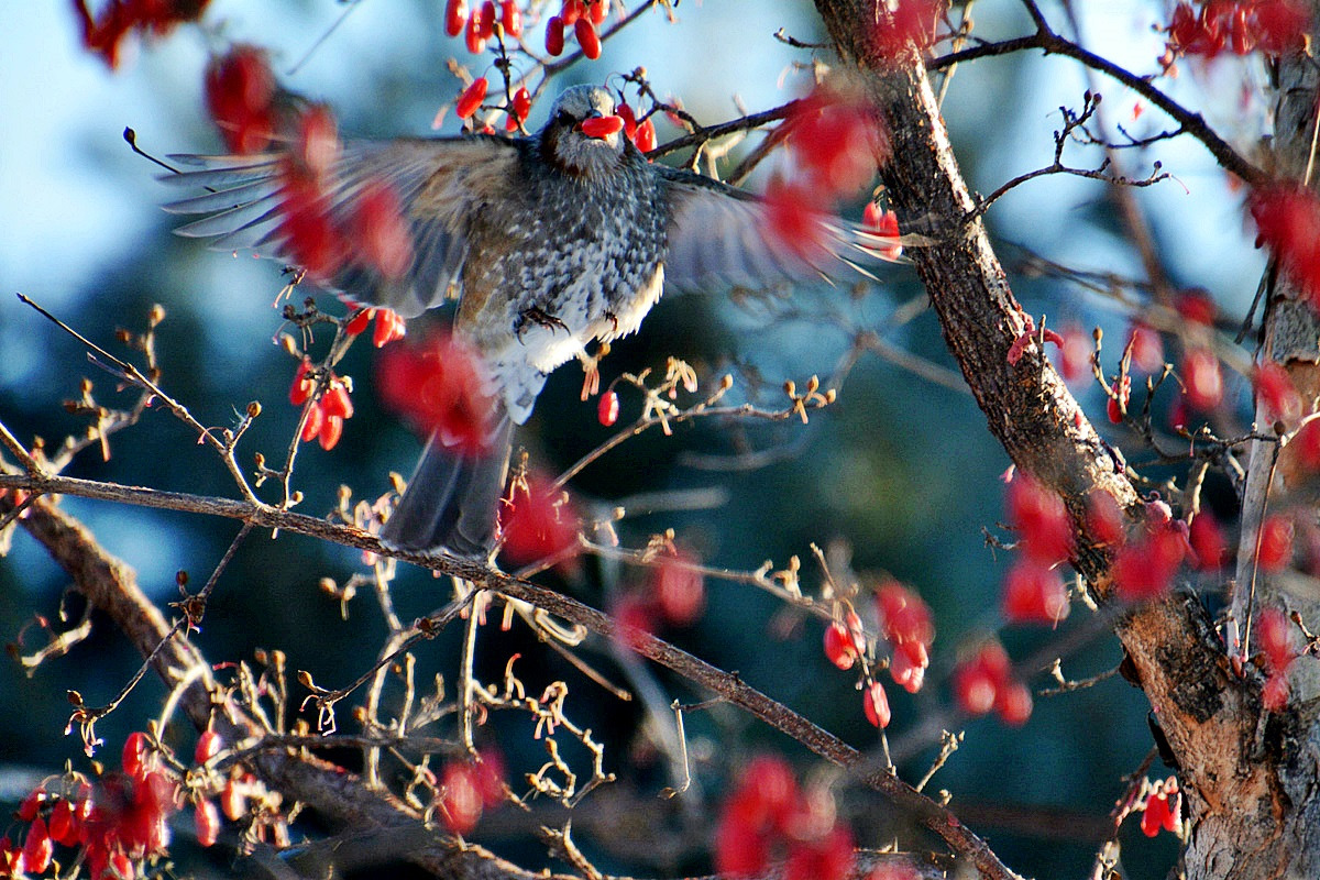 산수유길로 이동하니 직박구리, 개똥지빠귀, 노랑지빠귀등 새들의 먹이잔치가 한창이다. (촬영일시 : 22 년 01 월 07 일)