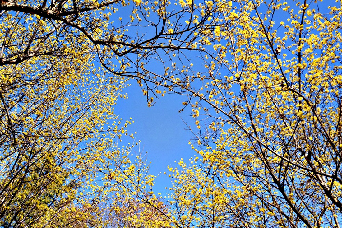봄의 전령 산수유가 절정기를 맞이하여 주변을 노랗게 물들이고 있다.