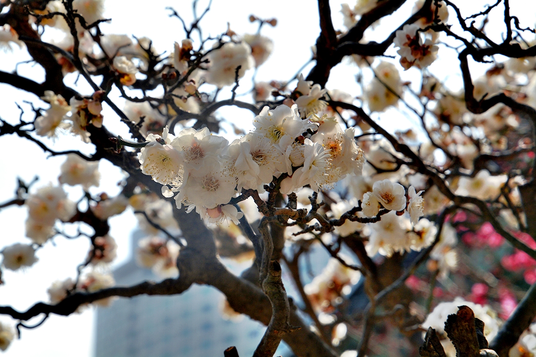 서울 삼성동 봉은사 매화당(梅花堂) 앞뜰 백매(白梅)가 한 구루의 홍매와 나란히