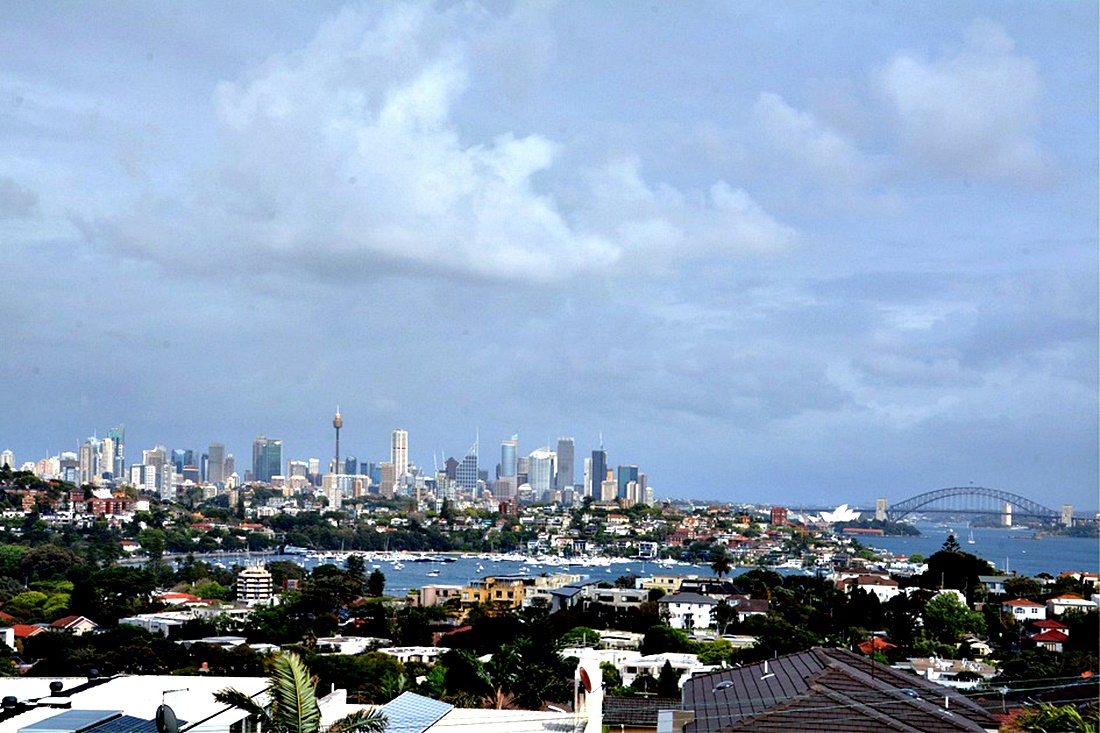 더들리 페이지에서 바라보는 시드니 시티는 푸른빛의 바다와 하늘, 멀리 보이는 하버 브리지, 오페라 하우스,